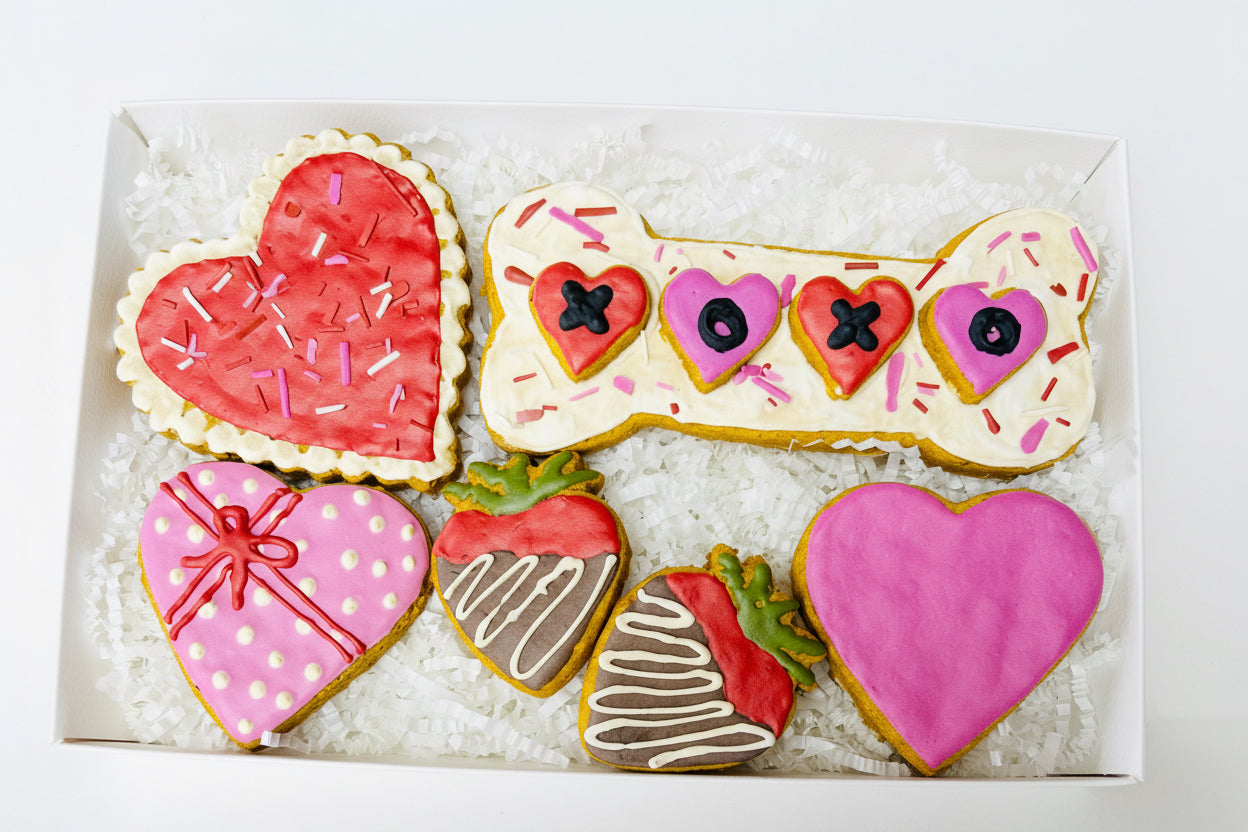 Our XOXO Box Set is a Valentine-inspired assortment of hand-decorated Pumpkidoodles, made to look extra sweet while staying 100% dog-safe.